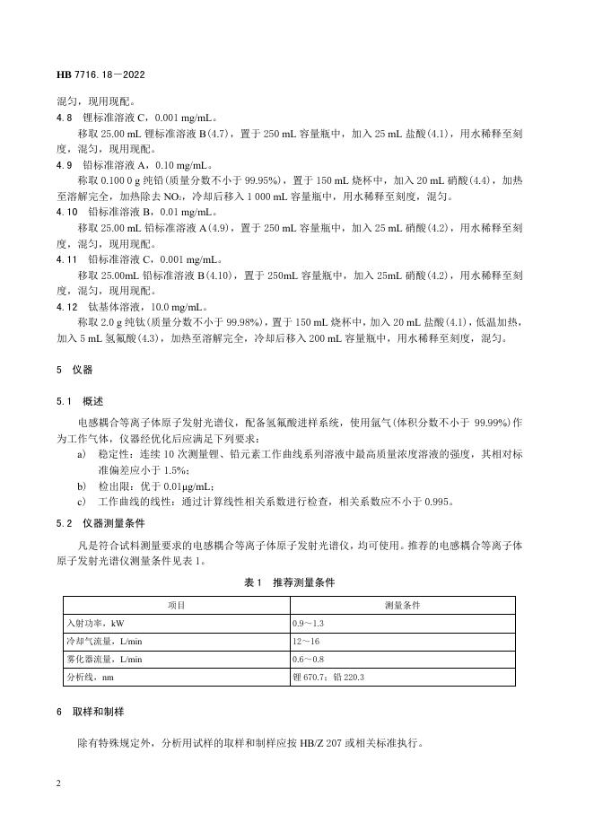 HB 7716.18-2022 钛合金化学成分光谱分析方法 第18部分:电感耦合等离子体原子发射光谱法测定锂、铅含量