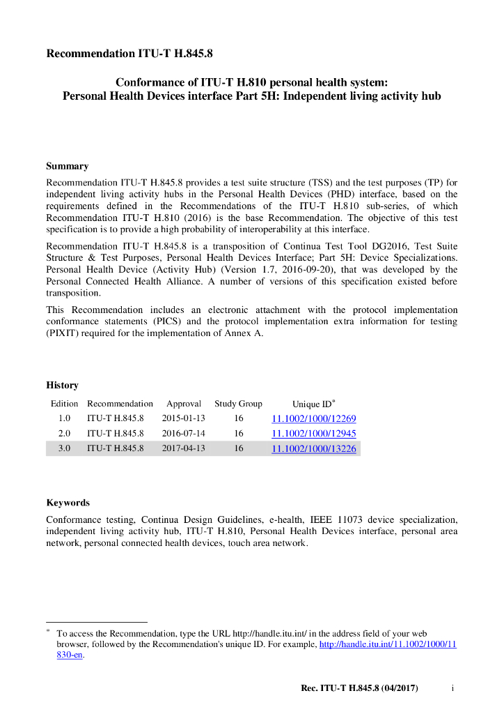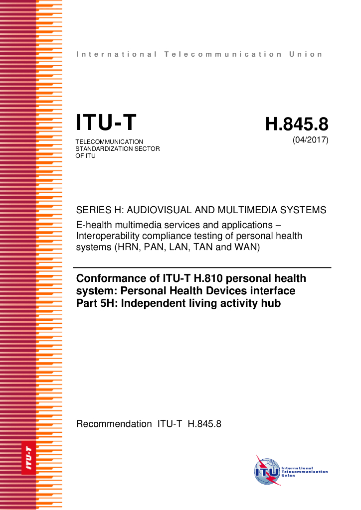 ITU-T H.845.8-2017 ITU-T H.810个人医疗卫生系统一致性 个人卫生设备接口 第5H部分 独立生活活动中心