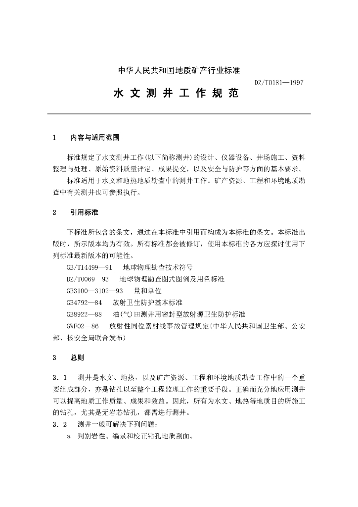DZ/T 0181-1997 水文测井工作规范
