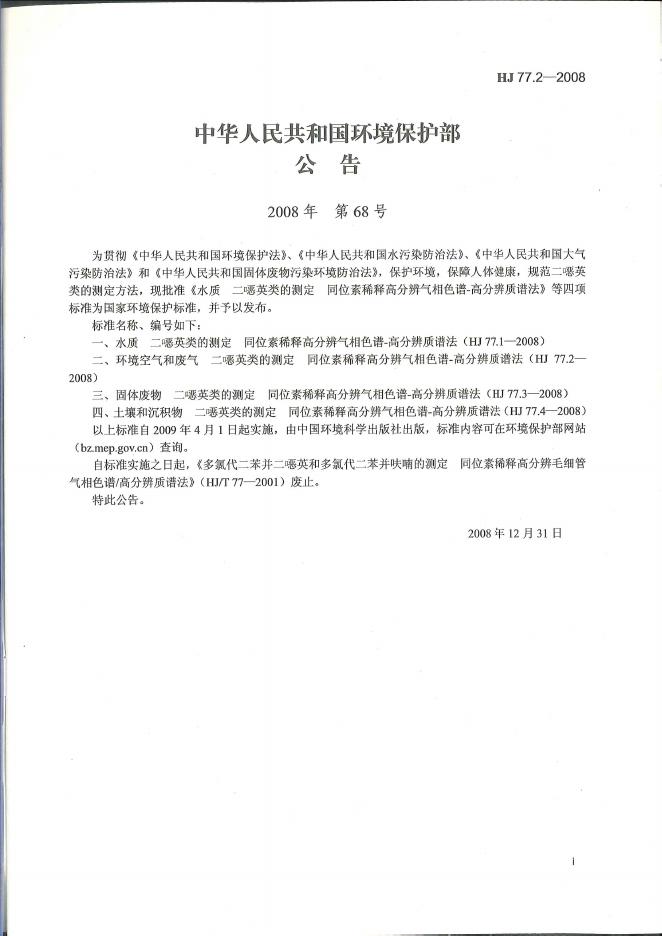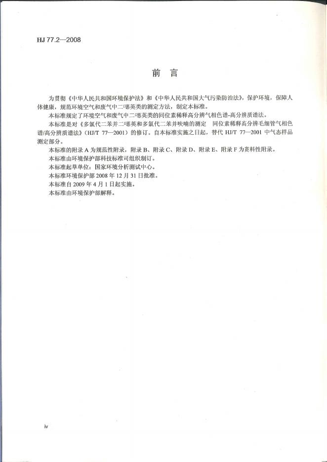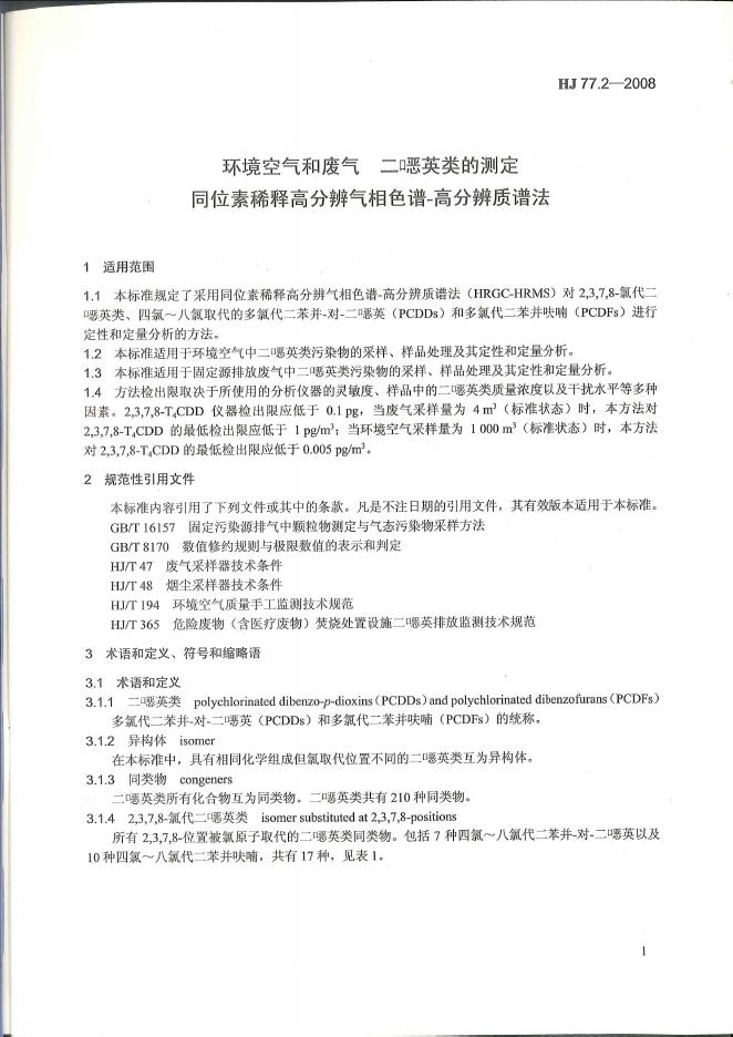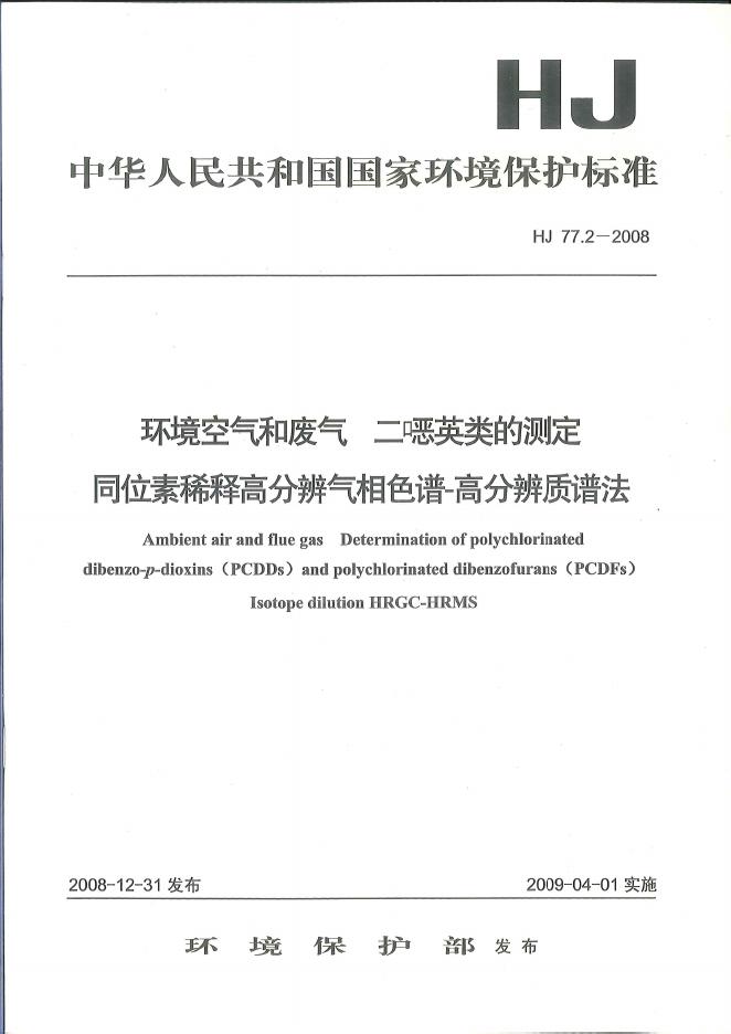 HJ 77.2-2008 环境空气和废气 二噁英类的测定 同位素稀释高分辨气相色谱-高分辨质谱法