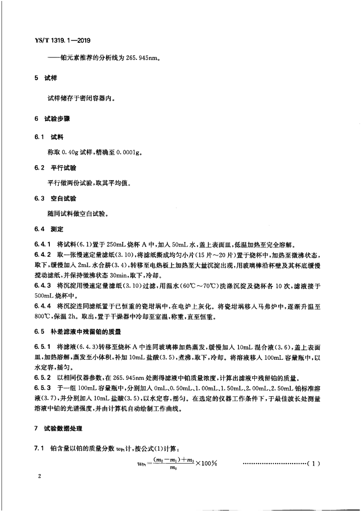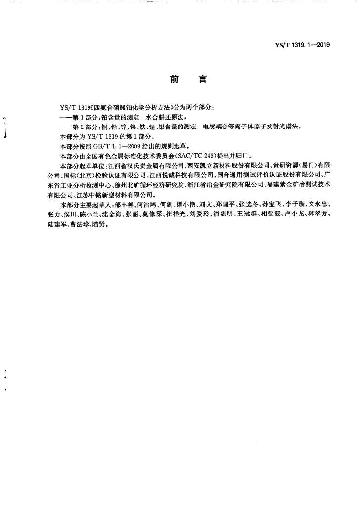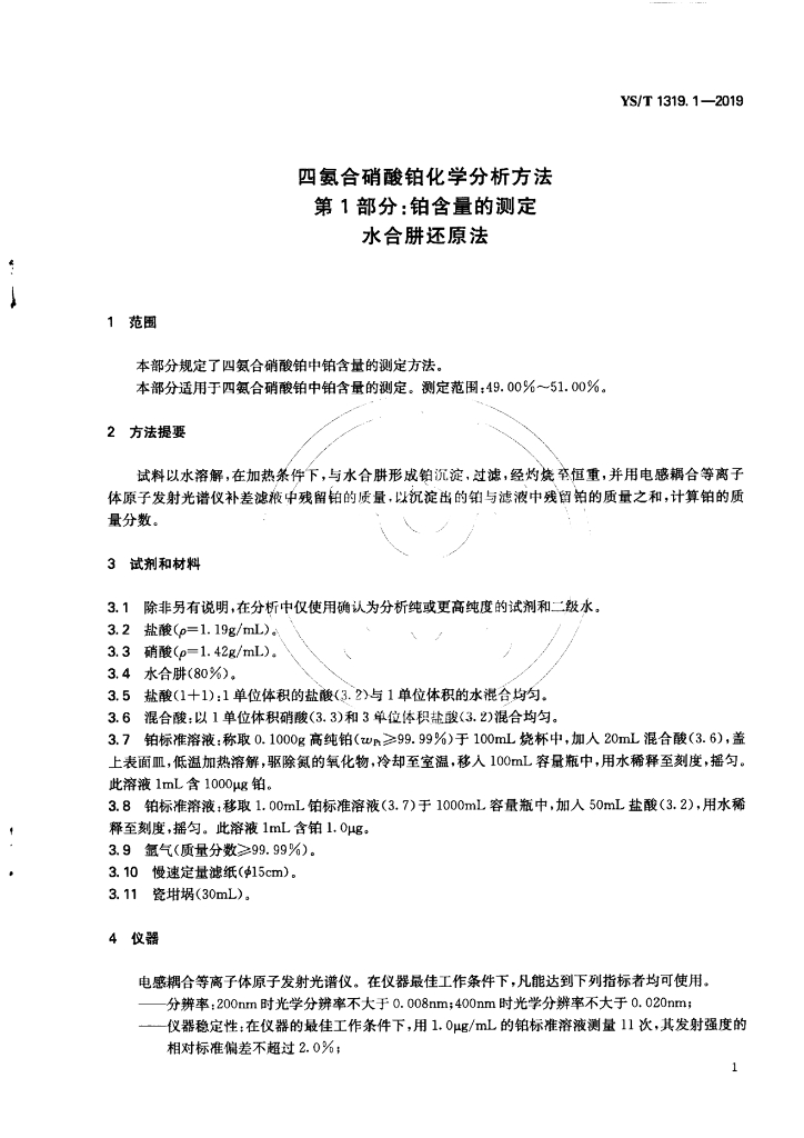 YS/T 1319.1-2019 四氨合硝酸铂化学分析方法 第1部分:铂含量的测定 水合肼还原法