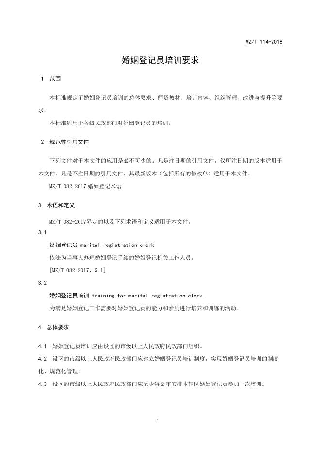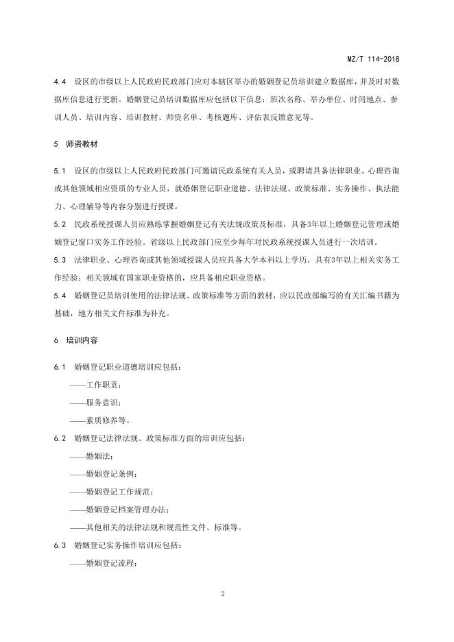 MZ/T 114-2018 婚姻登记员培训要求