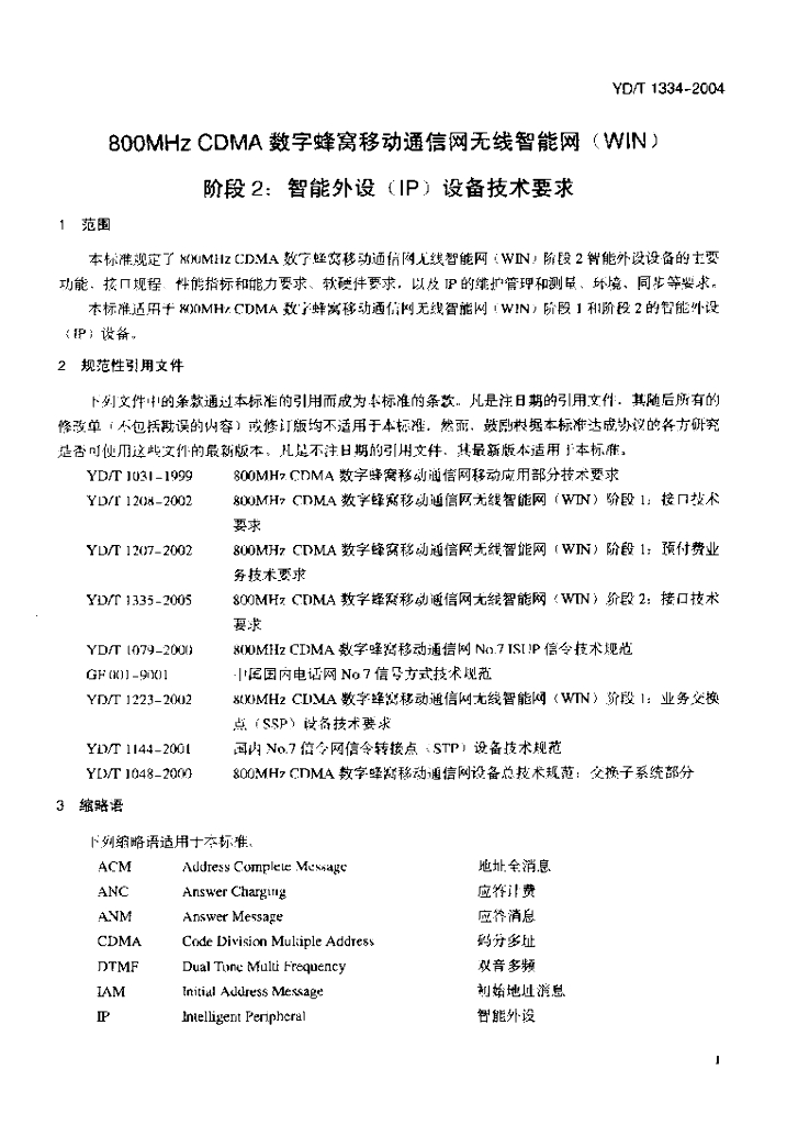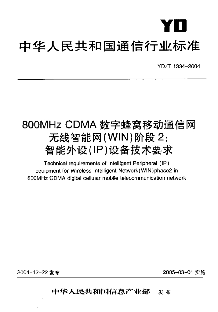 YD/T 1334-2004 800MHz CDMA 数字蜂窝移动通信网无线智能网(WIN)阶段2:智能外设(IP)设备技术要求