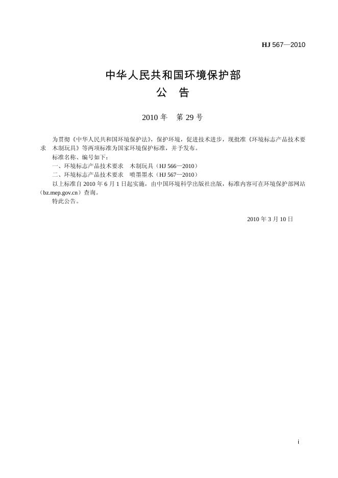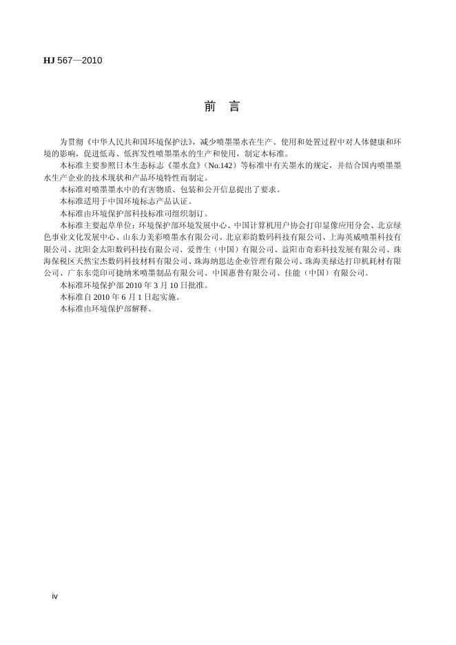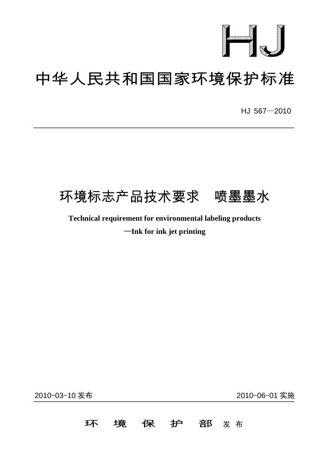 HJ 567-2010 环境标志产品技术要求 喷墨墨水