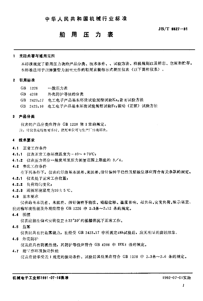 JB/T 5527-1991 船用压力表