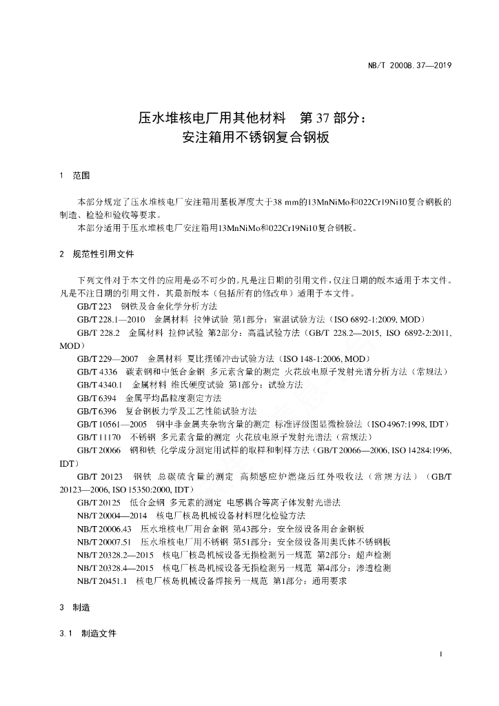 NB/T 20008.37-2019 压水堆核电厂用其他材料 第37部分:安注箱用不锈钢复合钢板