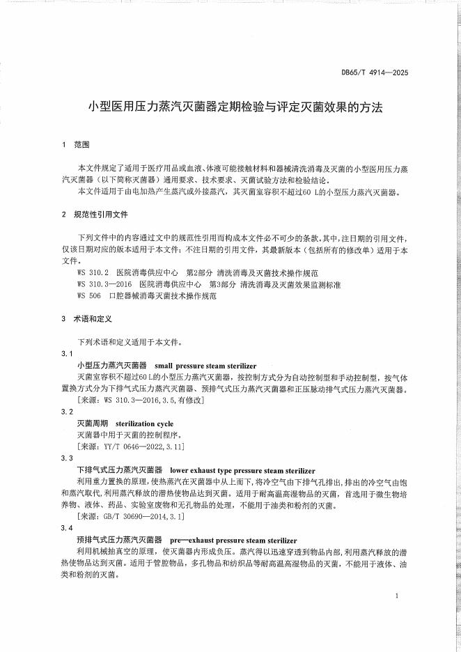 DB65/T 4914-2025 小型医用压力蒸汽灭菌器定期检验与评定灭菌效果的方法