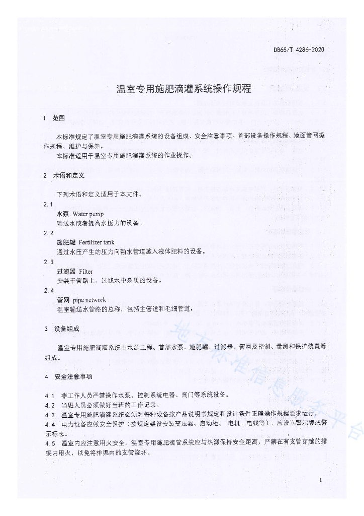 DB65/T 4286-2020 温室专用施肥滴灌系统 操作规程
