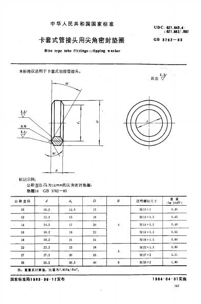 GB/T 3762-1983 卡套式管接头用尖角密封垫圈
