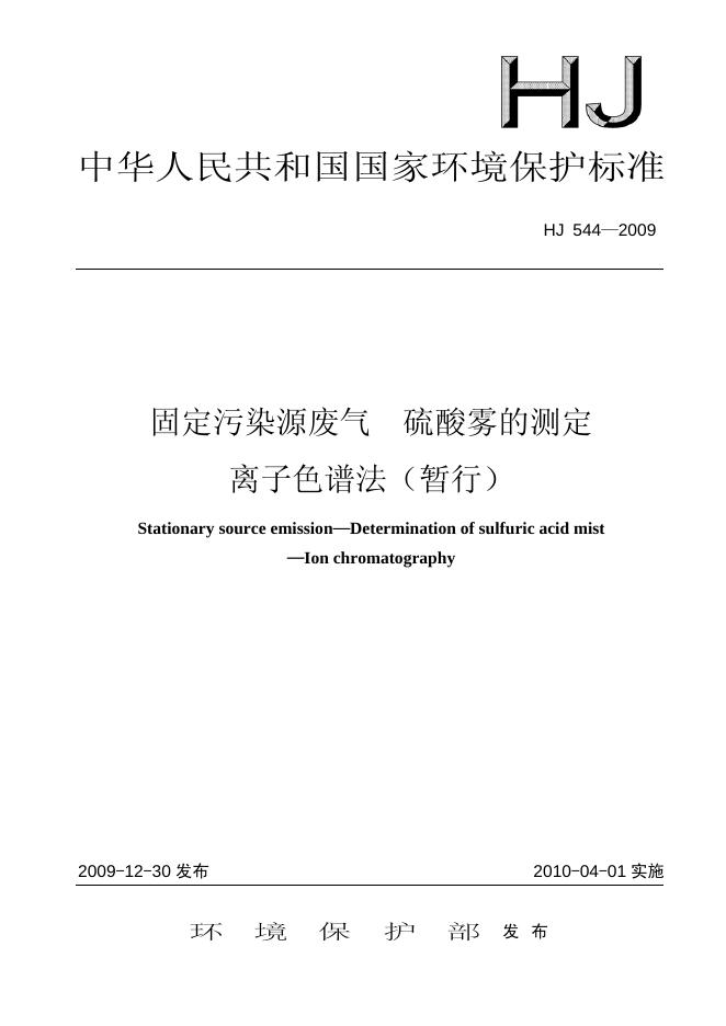 HJ 544-2009 固定污染源废气 硫酸雾的测定 离子色谱法(暂行)