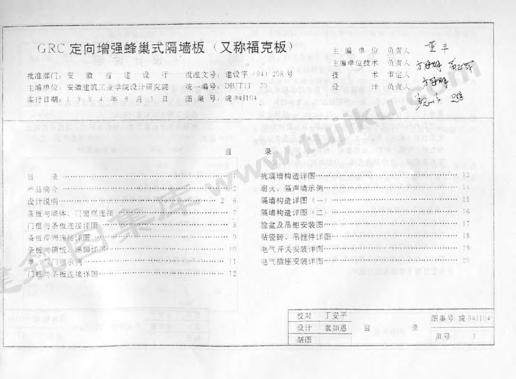 皖94J104 GRC定向增强蜂巢式隔墙板图集