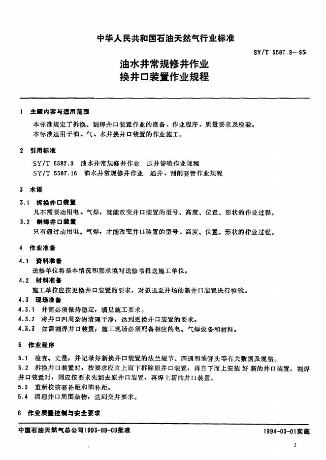 SY/T 5587.9-1993 油水井常规修井作业 换井口装置作业规程