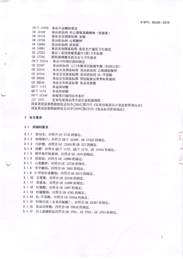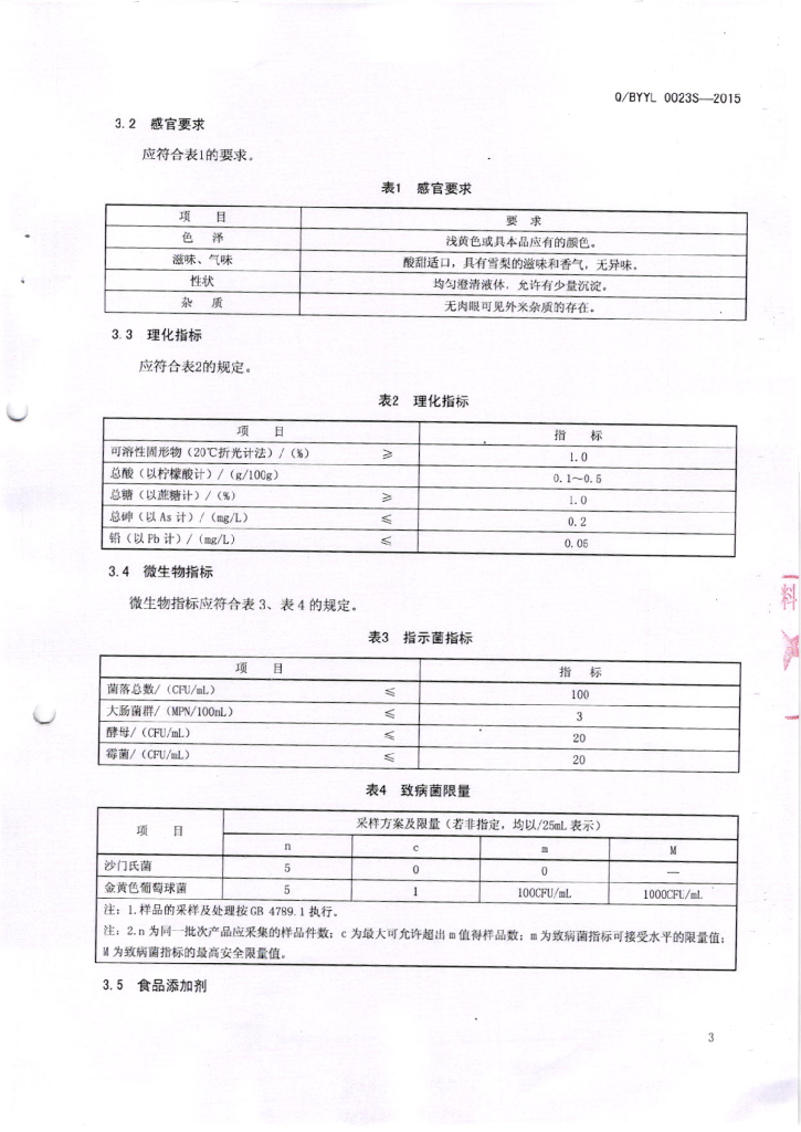 Q/BYYL O023S-2015 中山市百怡饮料有限公司 梨汁饮料