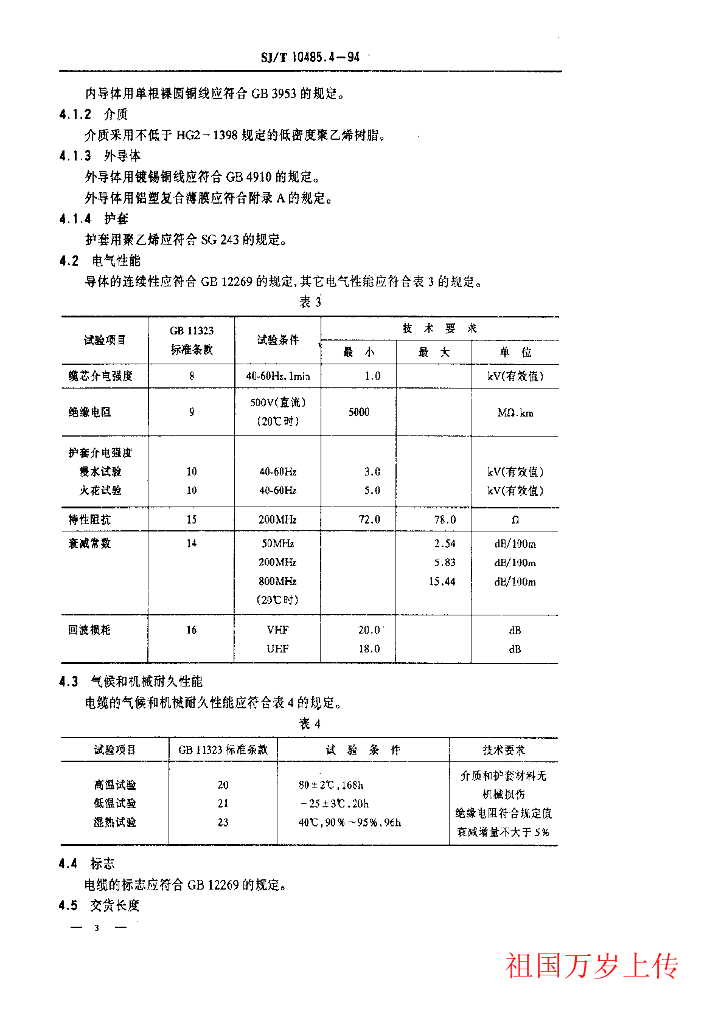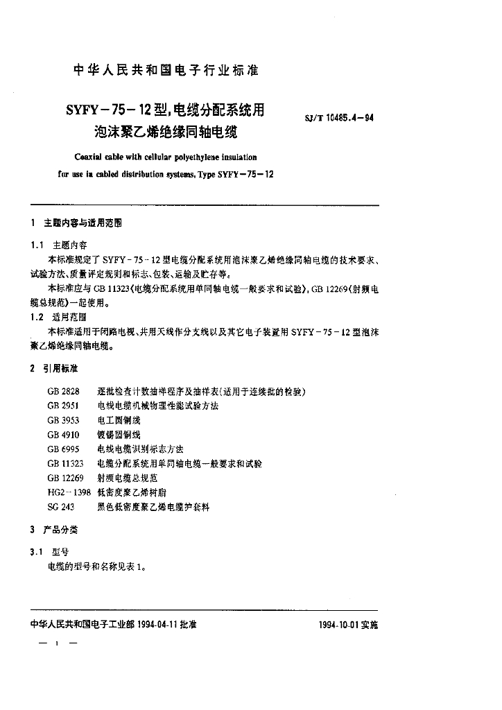 SJ/T 10485.4-1994 SYFV-75-12型电缆分配系统用泡沫聚乙烯绝缘同轴电缆