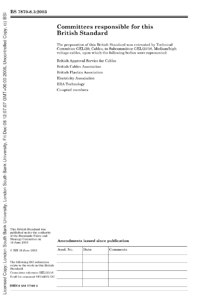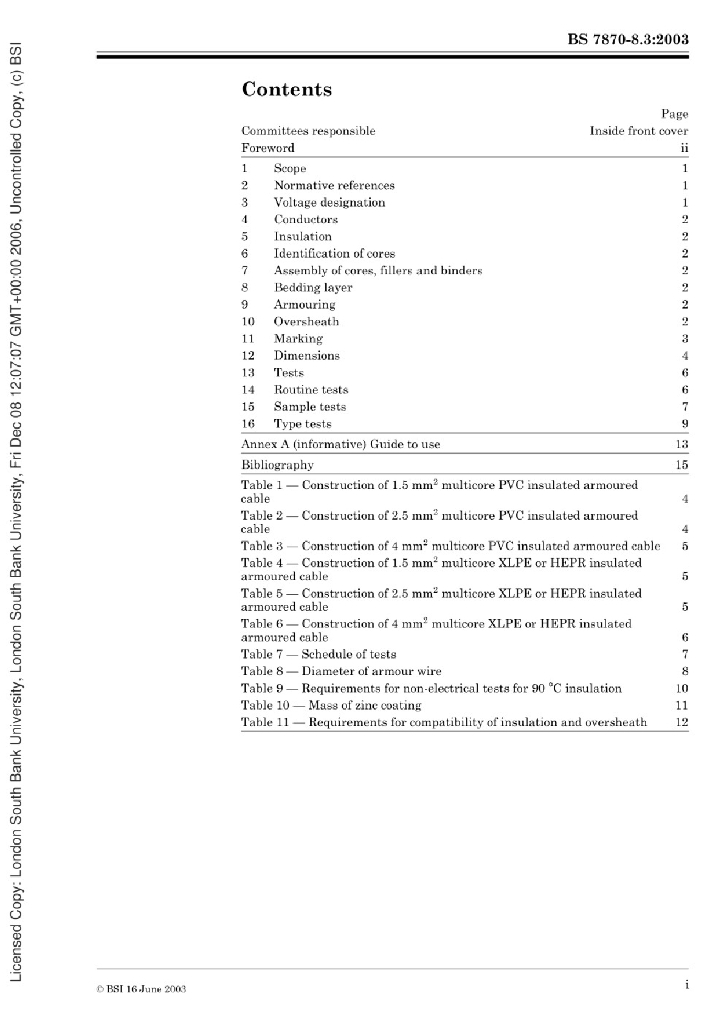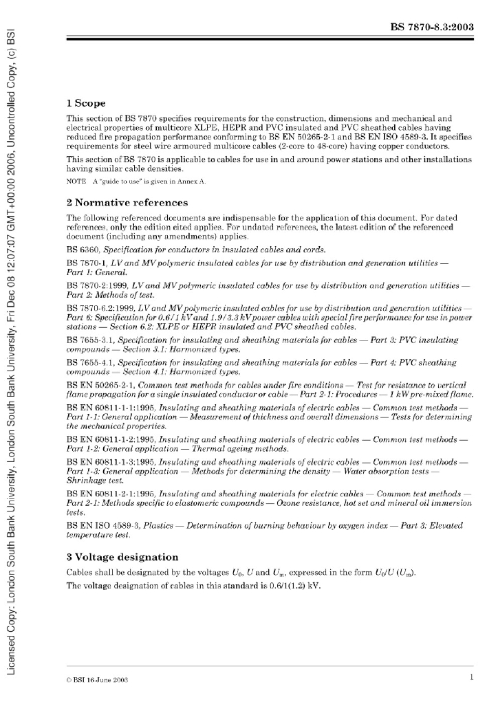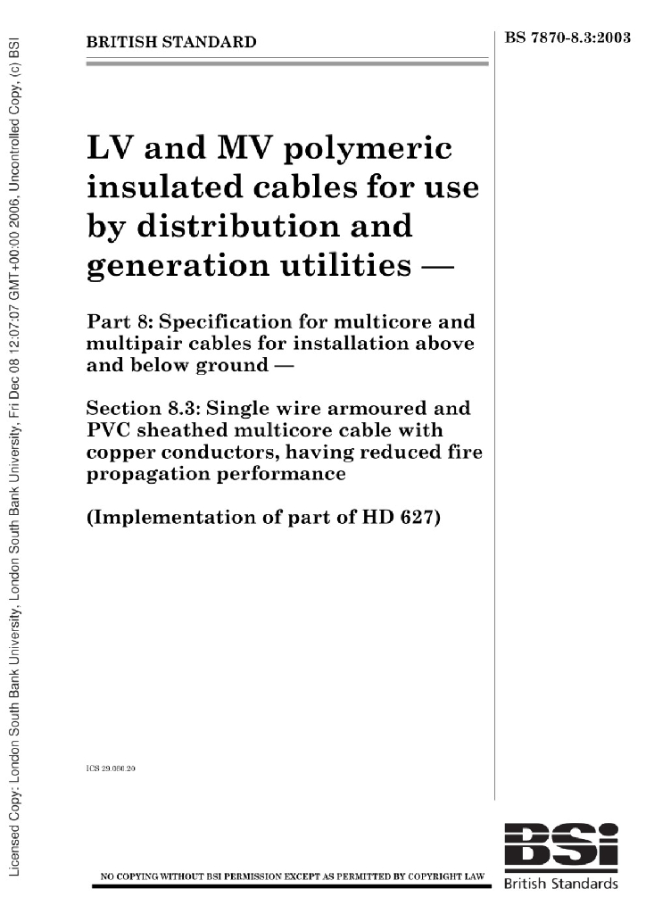 BS 7870-8.3:2003 用于配电和发电设备的低压和中压聚合物绝缘电缆。多核和多股电缆地上和地下安装规范。单导线铠装聚氯乙烯护套铜导线多芯电缆,降低了火灾传播性能。第8.3节单导线铠装聚氯乙烯护套铜导线多芯电缆,具有降低火焰传播性能