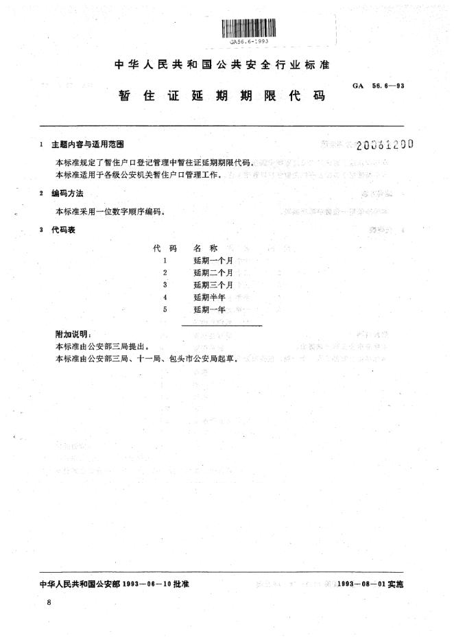 GA 56.6-1993 暂住人口基本信息管理标准 暂住证延期期限代码
