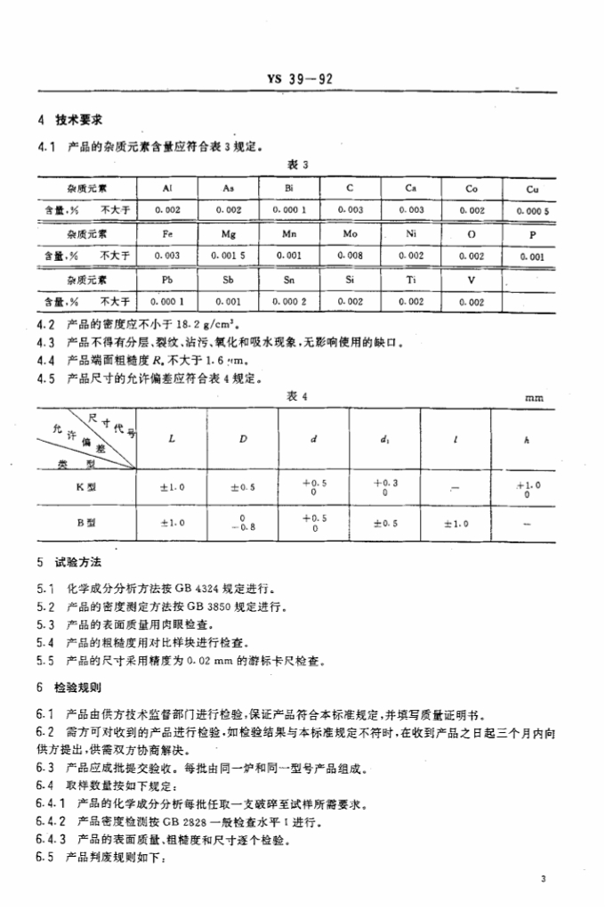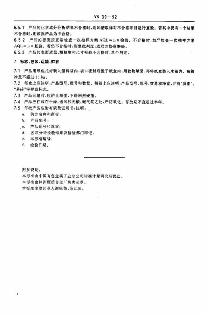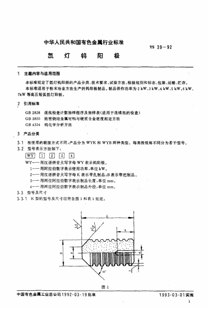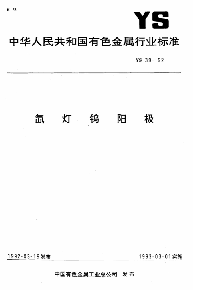 YS 39-1992 氙灯钨阳极