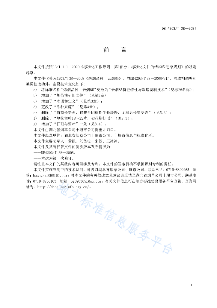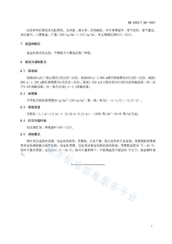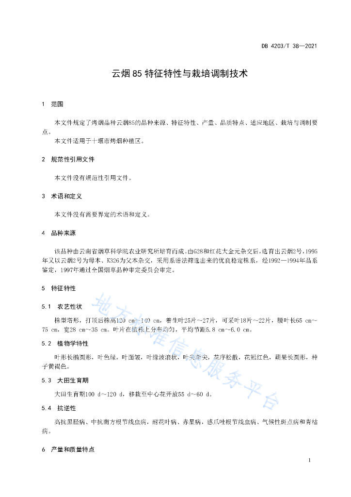 DB4203/T 38-2021 云烟85特征特性与栽培调制技术