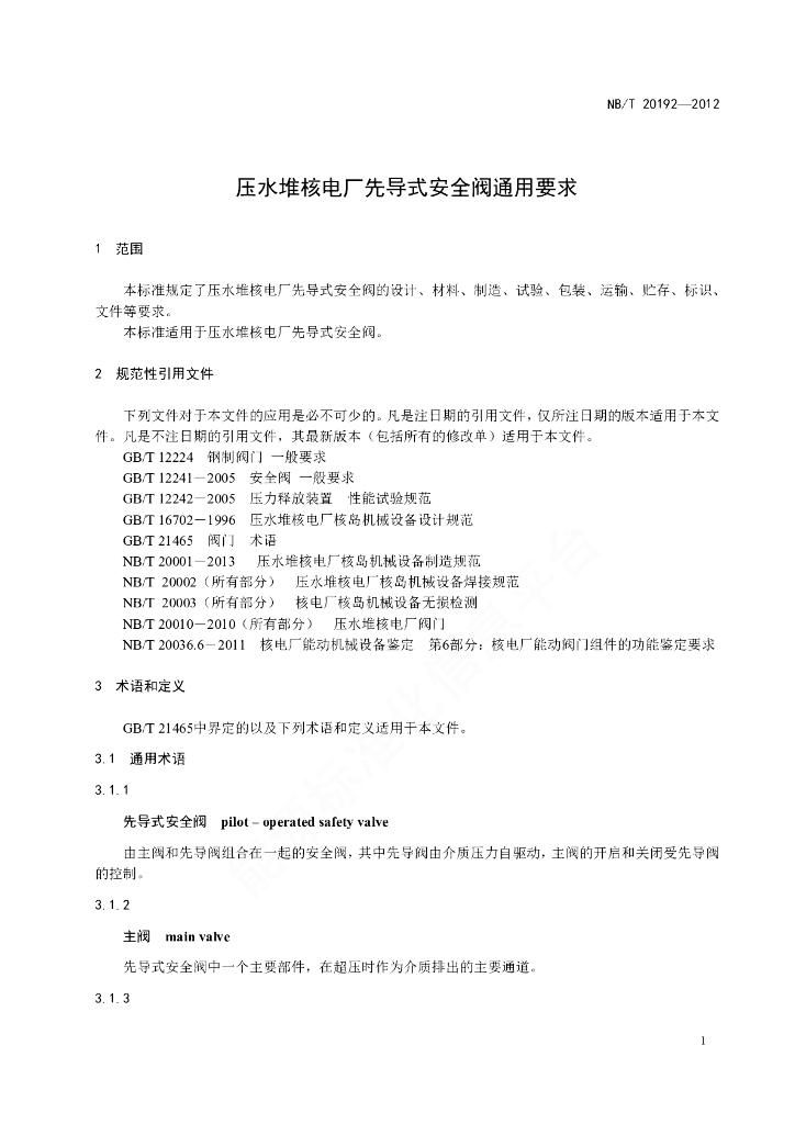 NB/T 20192-2012 压水堆核电厂先导式安全阀通用要求