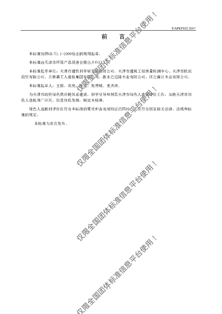 天津市建筑科学研究院有限公司、天津市建筑工程质量检测中心、天津市欧派商贸有限公司、吉林森工人造板集团有限公司、衡水巴迈隆木业有限公司、河北霖江木业有限公司