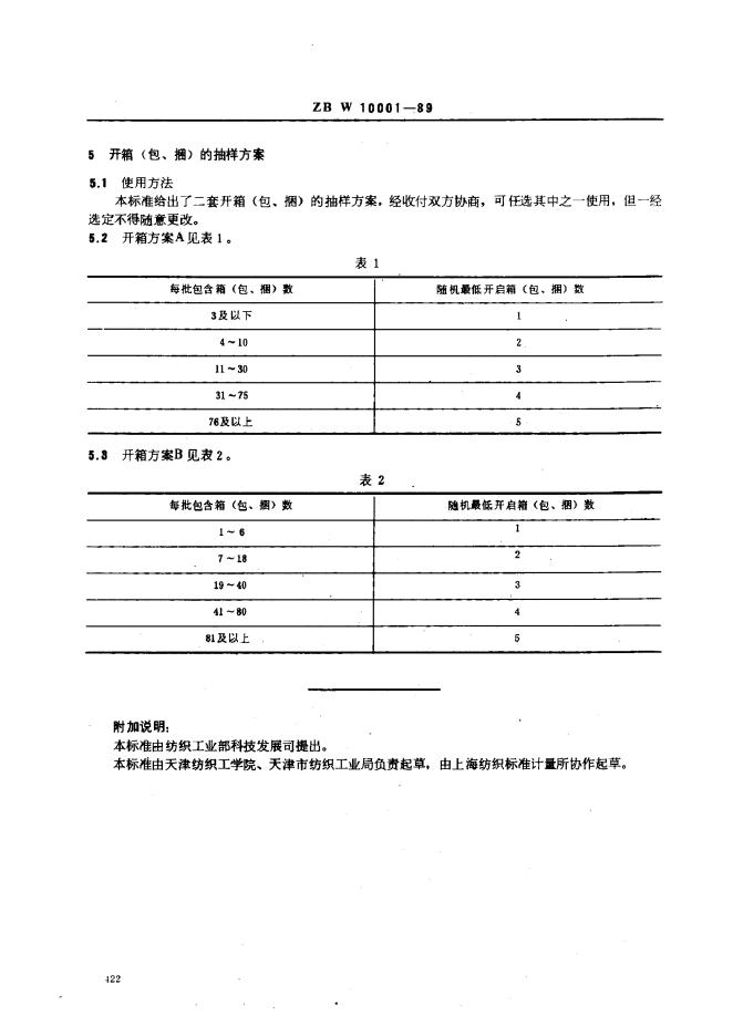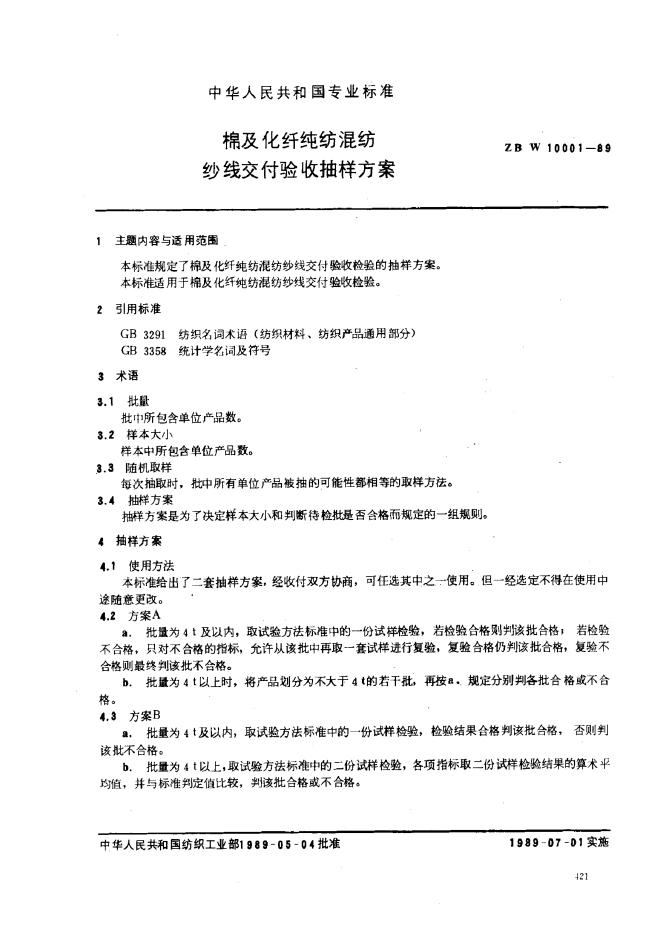 ZBW 10001-1989 棉及化纤纯混纺纱线交付验收抽样方案