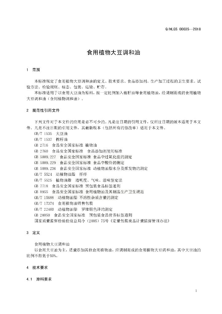 Q/HLGS 0003S-2018 食用植物大豆调和油