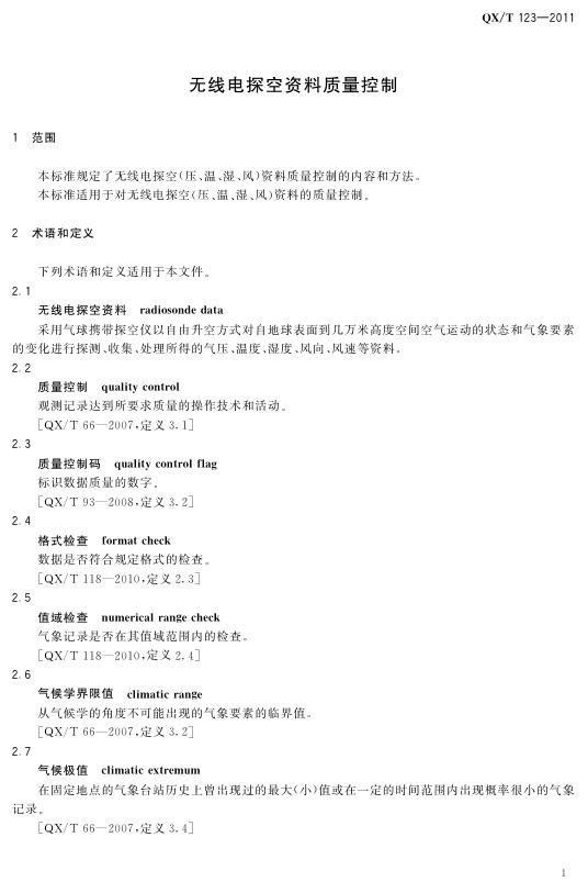 QX/T 123-2011 无线电探空资料质量控制