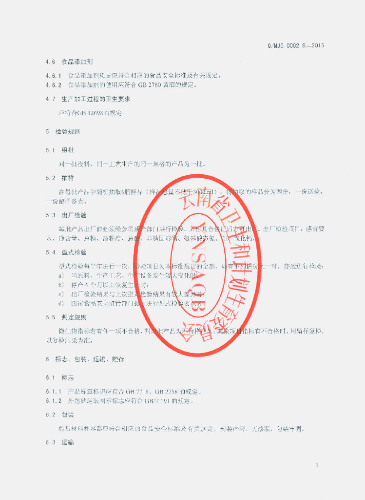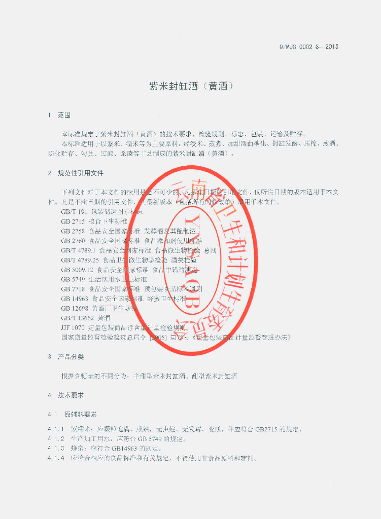 Q/MJG 0002S-2015 墨江酒江酒业有限公司 紫米封缸酒(黄酒)