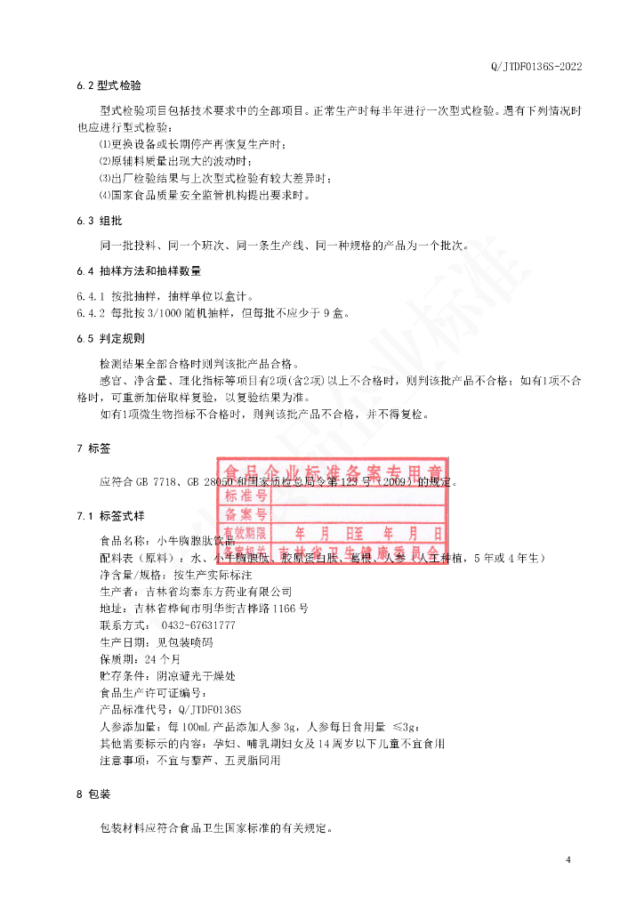 Q/JTDF 0136S-2022 小牛胸腺肽饮品