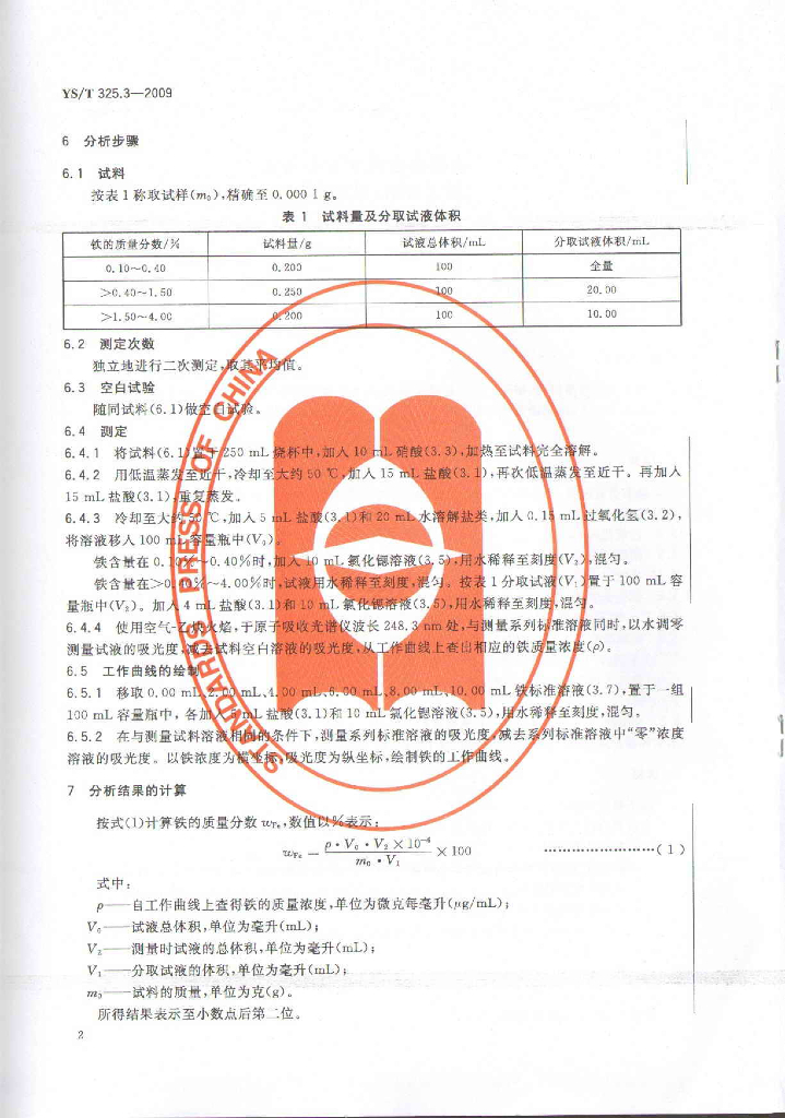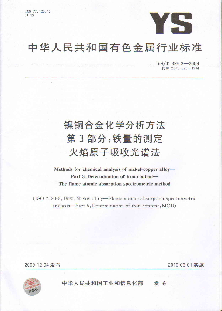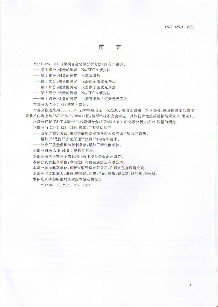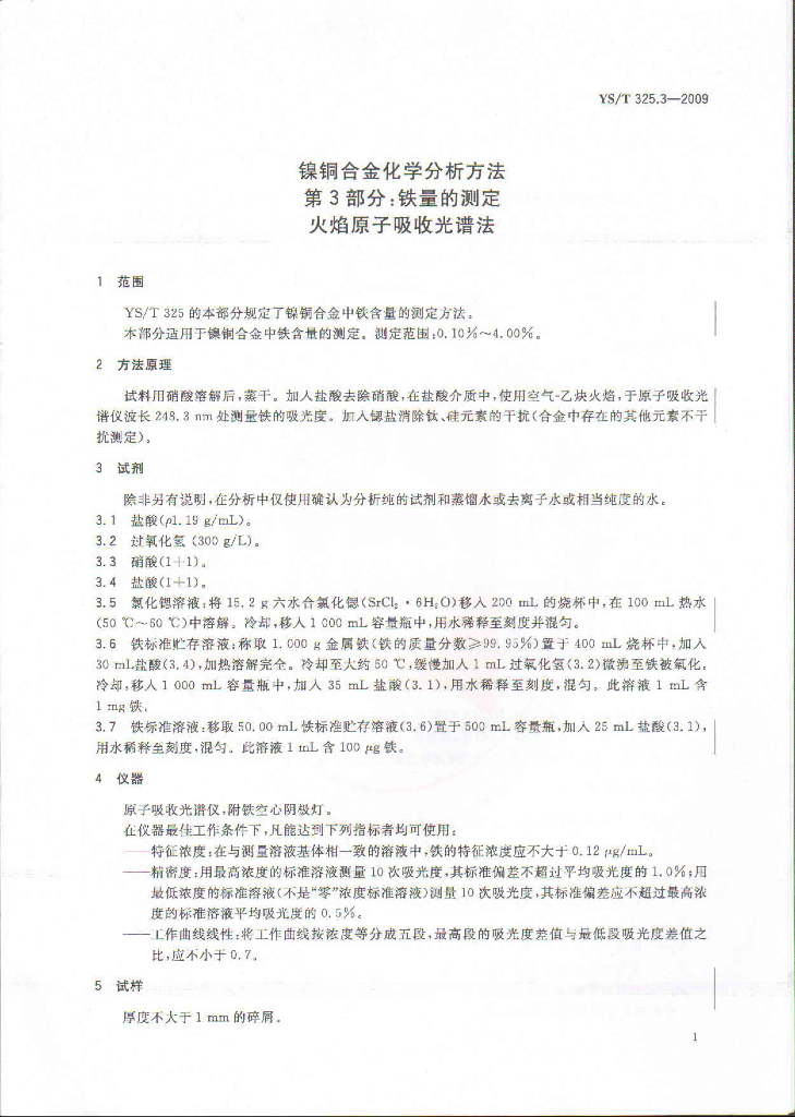 YS/T 325.3-2009 镍铜合金化学分析方法 第3部分:铁量的测定 火焰原子吸收光谱法