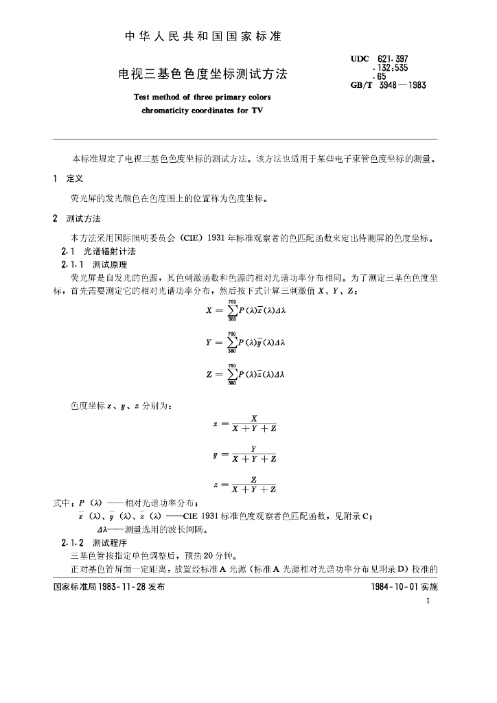 GB/T 3948-1983 电视三基色色度坐标测试方法
