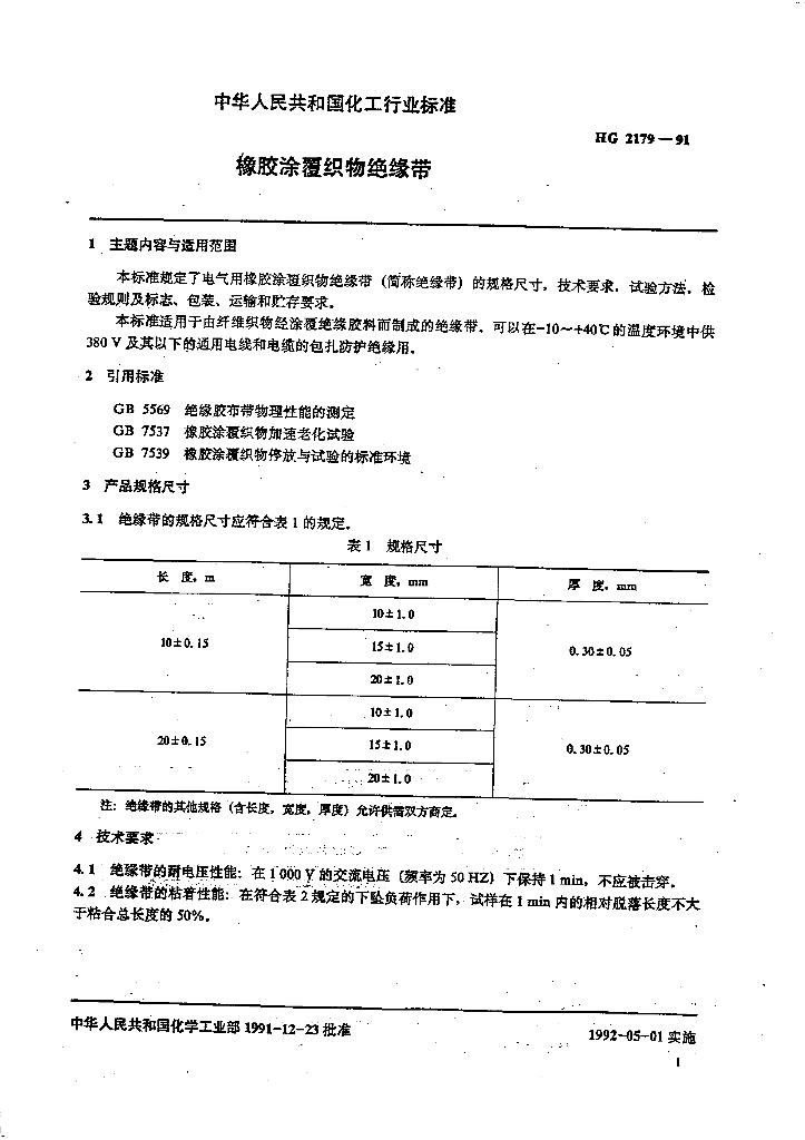 HG 2179-1991 橡胶涂覆织物绝缘带
