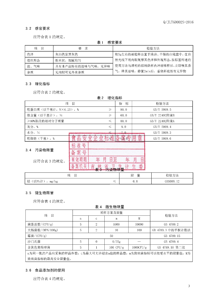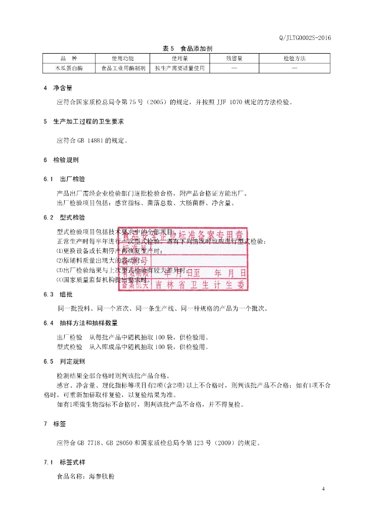 Q/JLTG 0002S-2016 林肽谷生物工程有限责任公司 海参肽粉