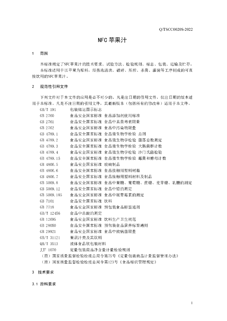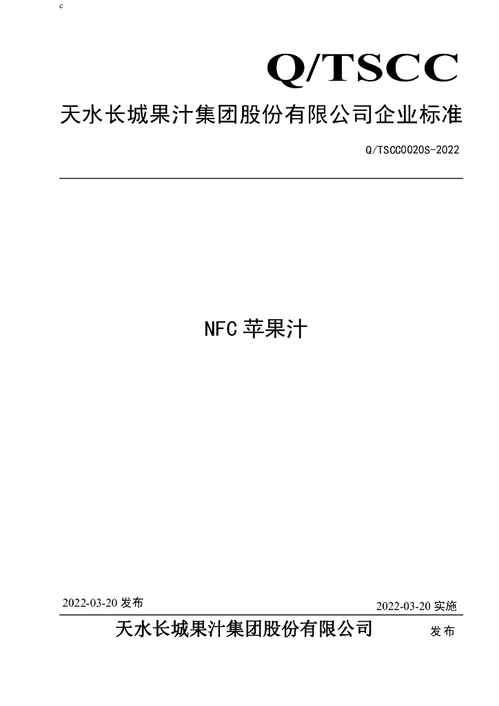 Q/TSCC 0020S-2022 NFC苹果汁