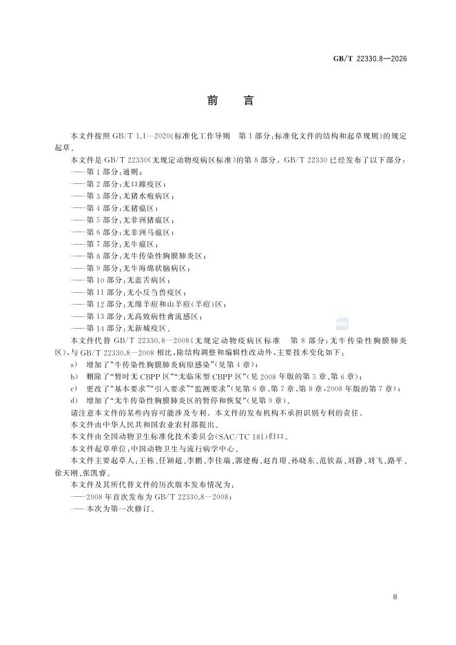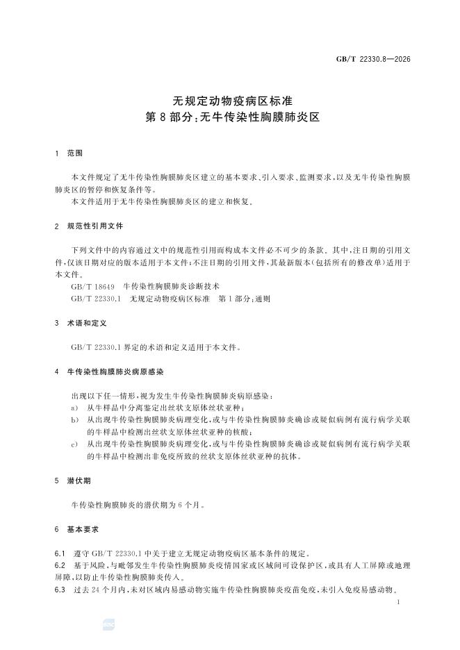 GB/T 22330.8-2026 无规定动物疫病区标准 第8部分:无牛传染性胸膜肺炎区