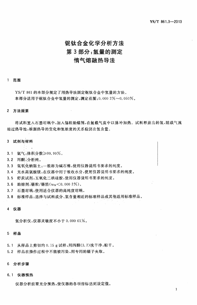 YS/T 861.3-2013 铌钛合金化学分析方法 第3部分:氢量的测定惰气熔融热导法