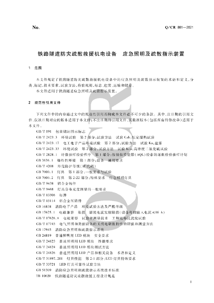 Q/CR 861-2021 铁路隧道防灾疏散救援机电设备应急照明及疏散指示装置