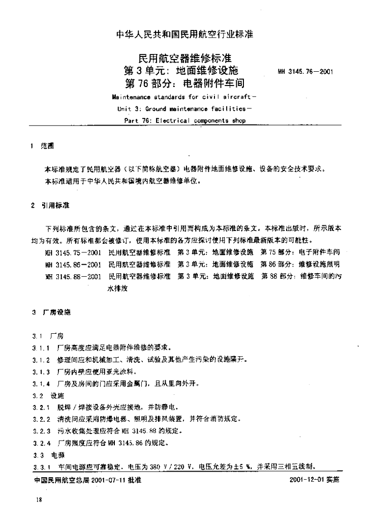 MH 3145.76-2001 民用航空器维修标准 第3单元 地面维修设施 第76部分 电器附件车间