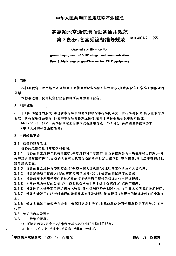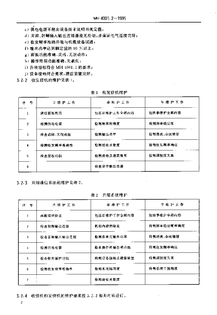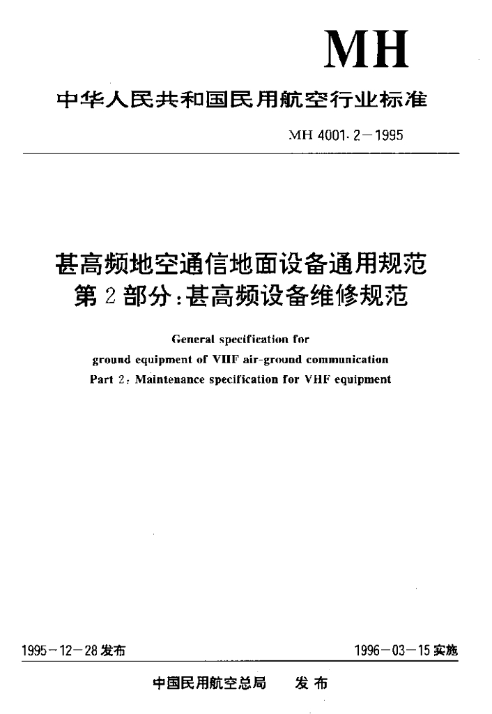 MH 4001.2-1995 甚高频地空通信地面设备通用规范第2部分 甚高频设备维修规范