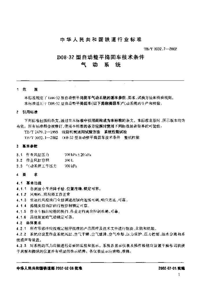 TB/T 3032.7-2002 D08-32型自动整平捣固车技术条件 气动系统