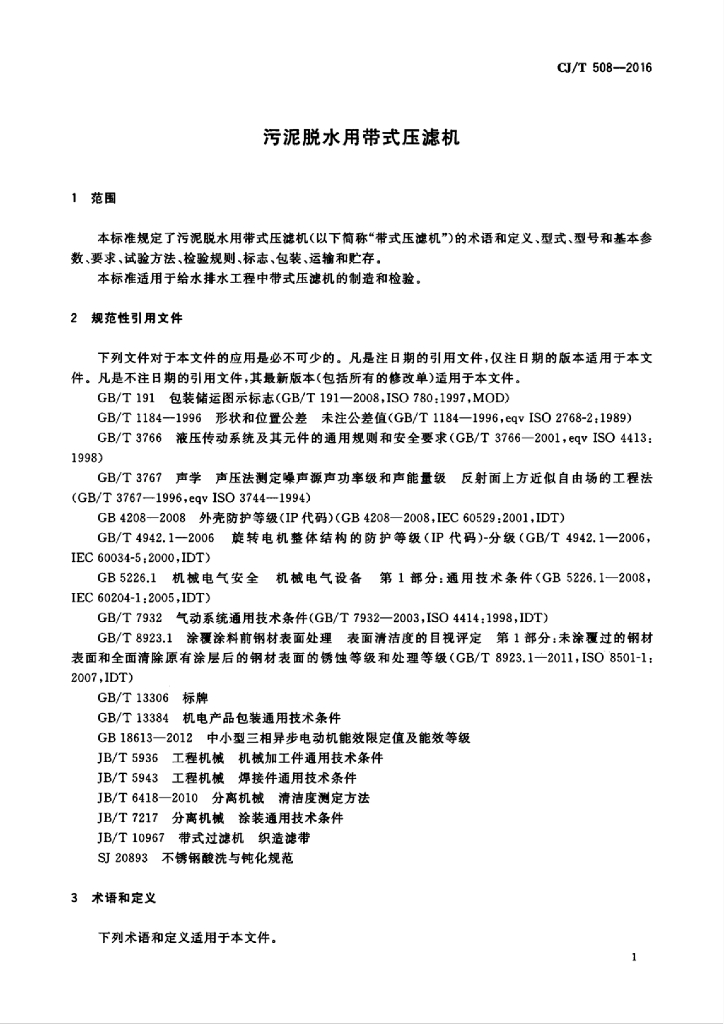 CJ/T 508-2016 污泥脱水用带式压滤机