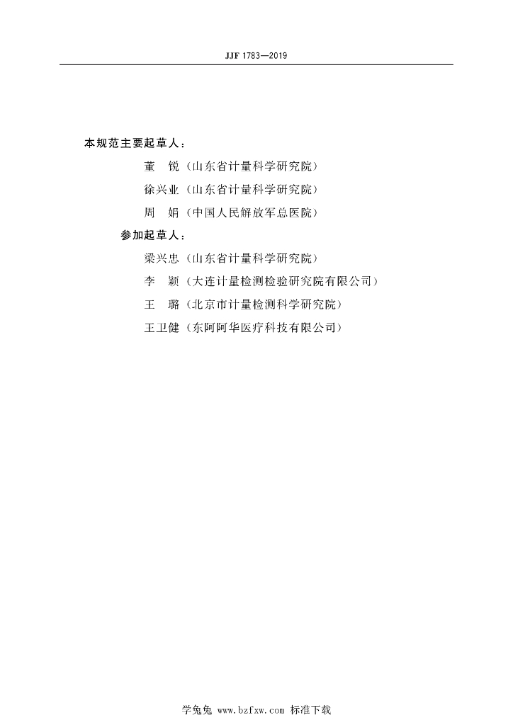 董锐(山东省计量科学研究院)、徐兴业(山东省计量科学研究院)、周娟(中国人民解放军总医院)、梁兴忠(山东省计量科学研究院)、李颖(大连计量检测检验研究院有限公司)、王璐(北京市计量检测科学研究院)、王卫健(东阿阿华医疗科技有限公司)