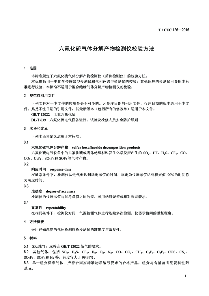 T/CEC 126-2016 六氟化硫气体分解产物检测仪校验方法