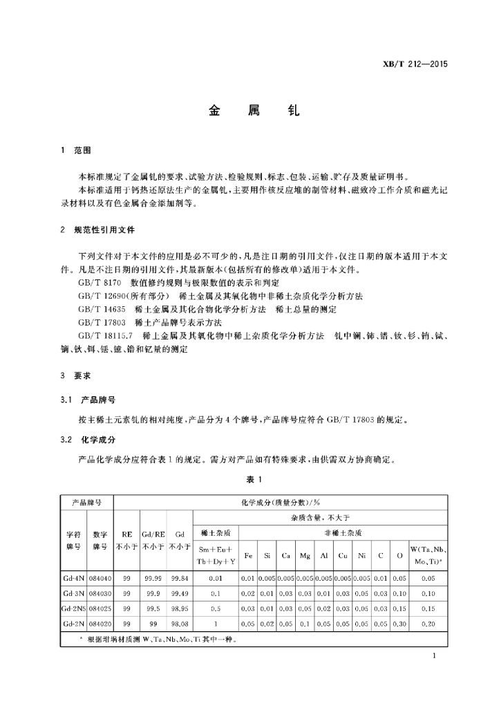 XB/T 212-2015 金属钆