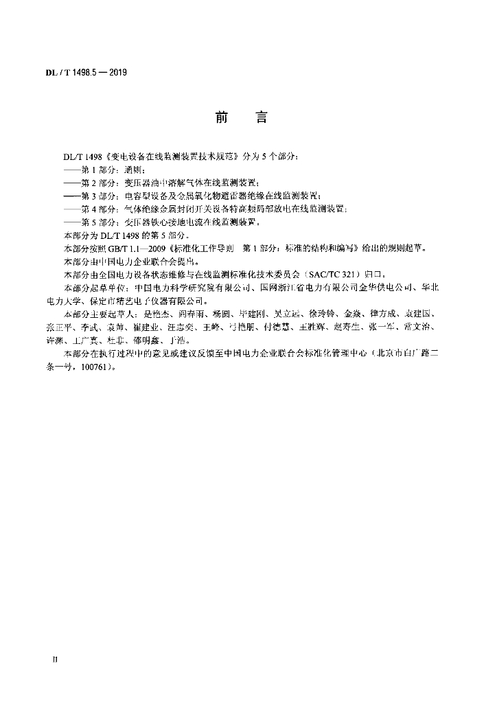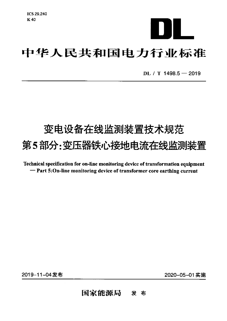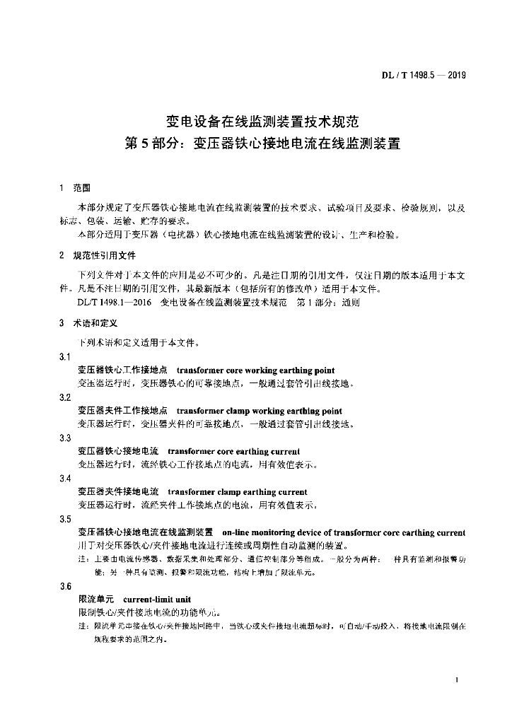 DL/T 1498.5-2019 变电设备在线监测装置技术规范 第5部分:变压器铁心接地电流在线监测装置