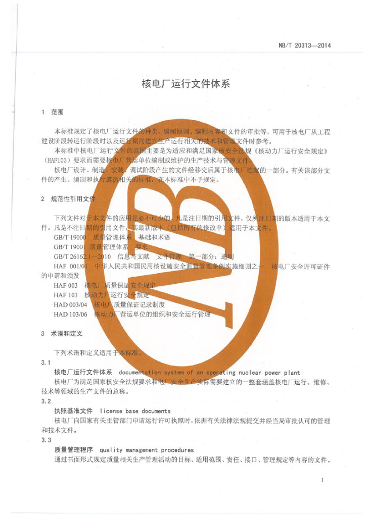 NB/T 20313-2014 核电厂运行文件体系