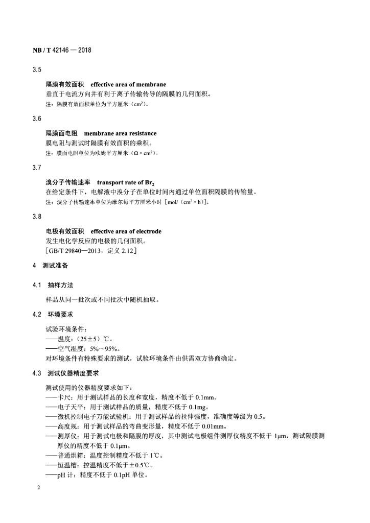 NB/T 42146-2018 锌溴液流电池 电极、隔膜、电解液测试方法