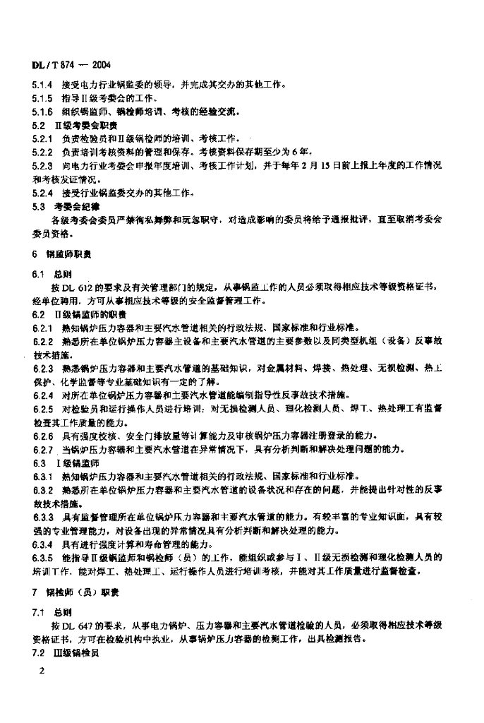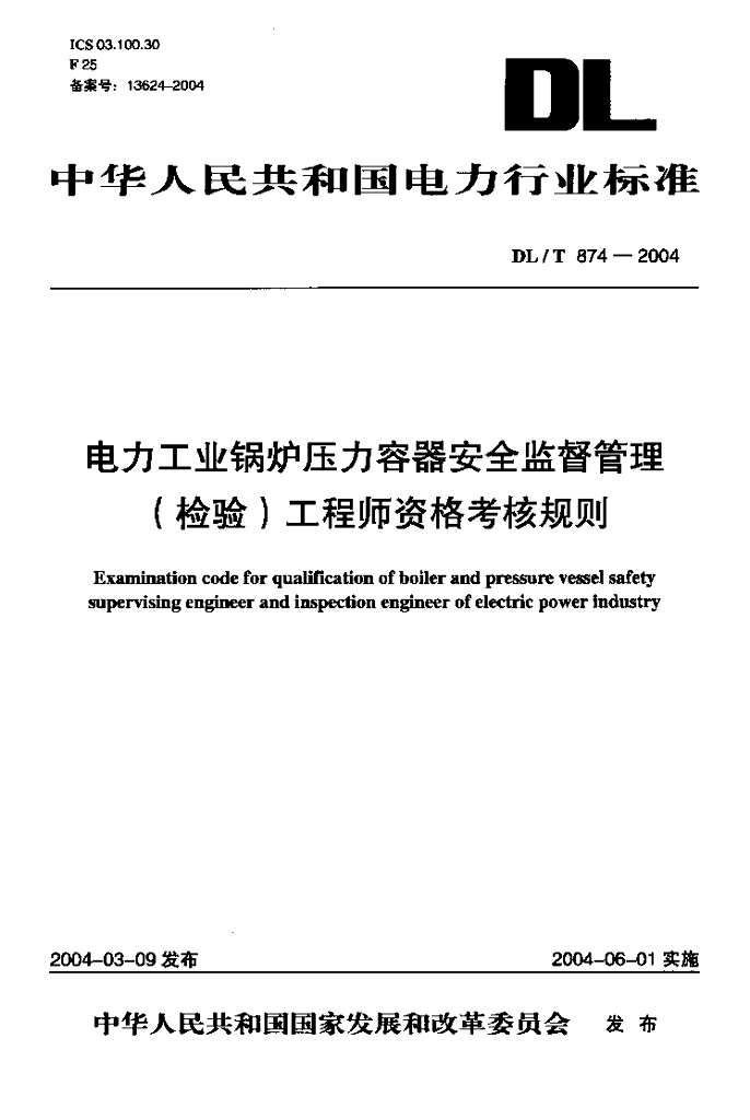 DL/T 874-2004 电力工业锅炉压力容器安全监督管理(检验)工程师资格考核规则