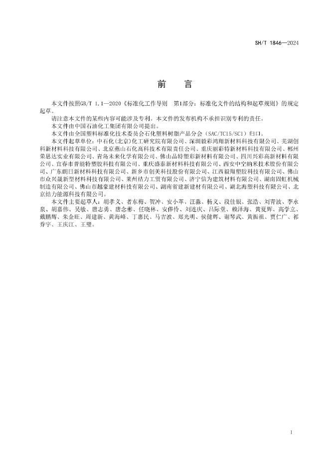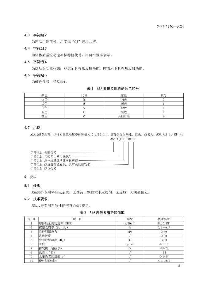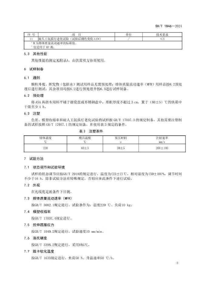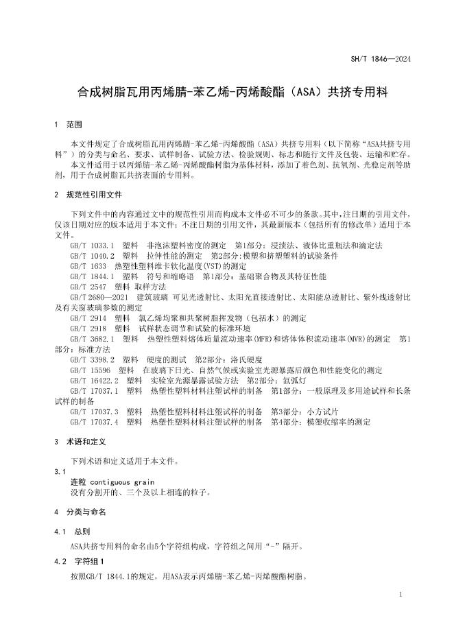 SH/T 1846-2024 合成树脂瓦用丙烯腈-苯乙烯-丙烯酸酯(ASA)共挤专用料