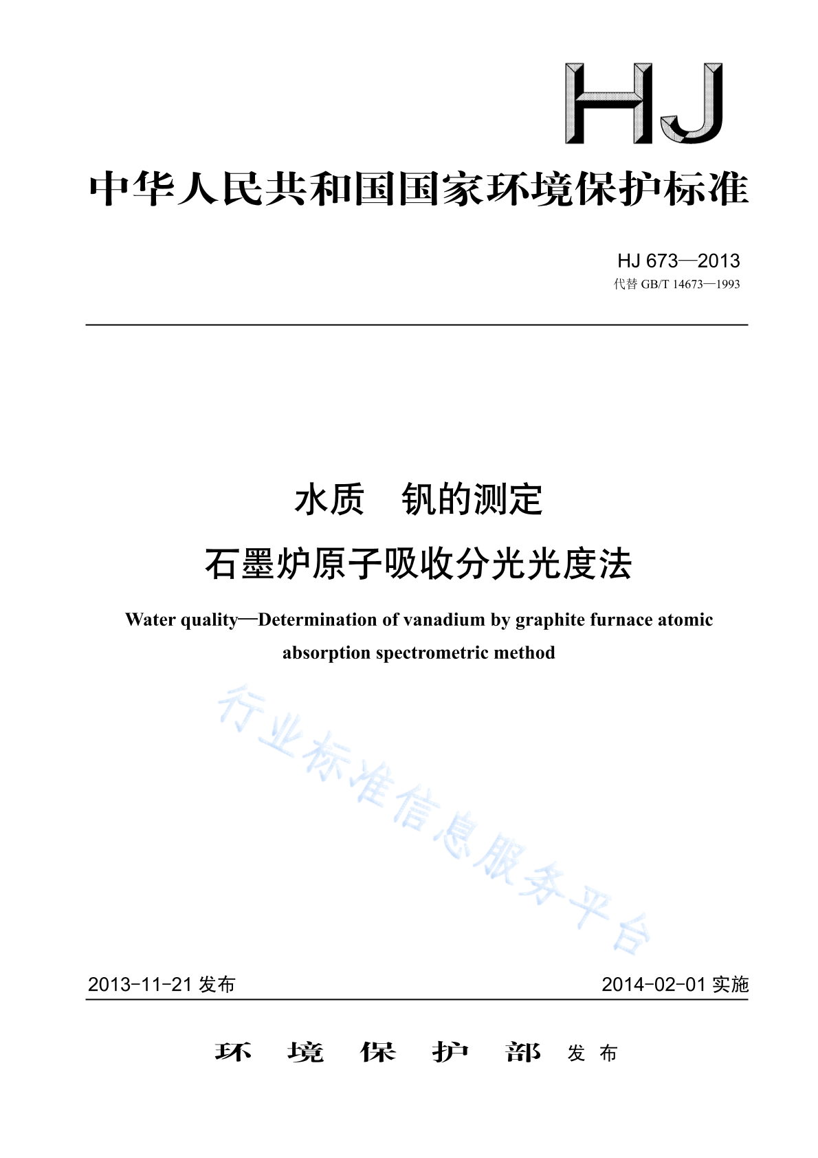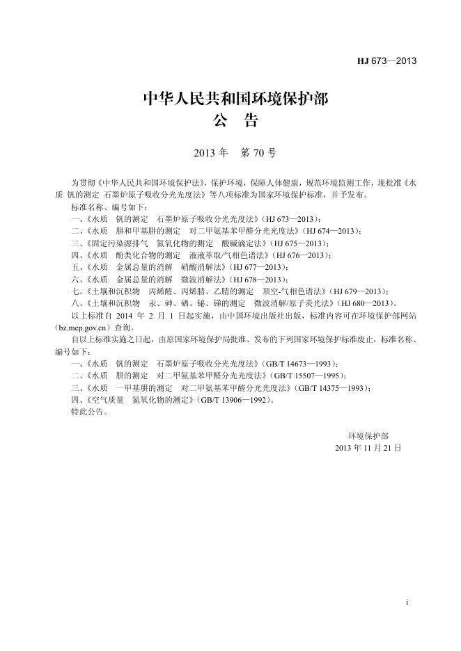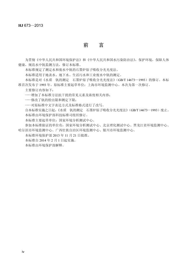 HJ 673-2013 水质 钒的测定 石墨炉原子吸收分光光度法